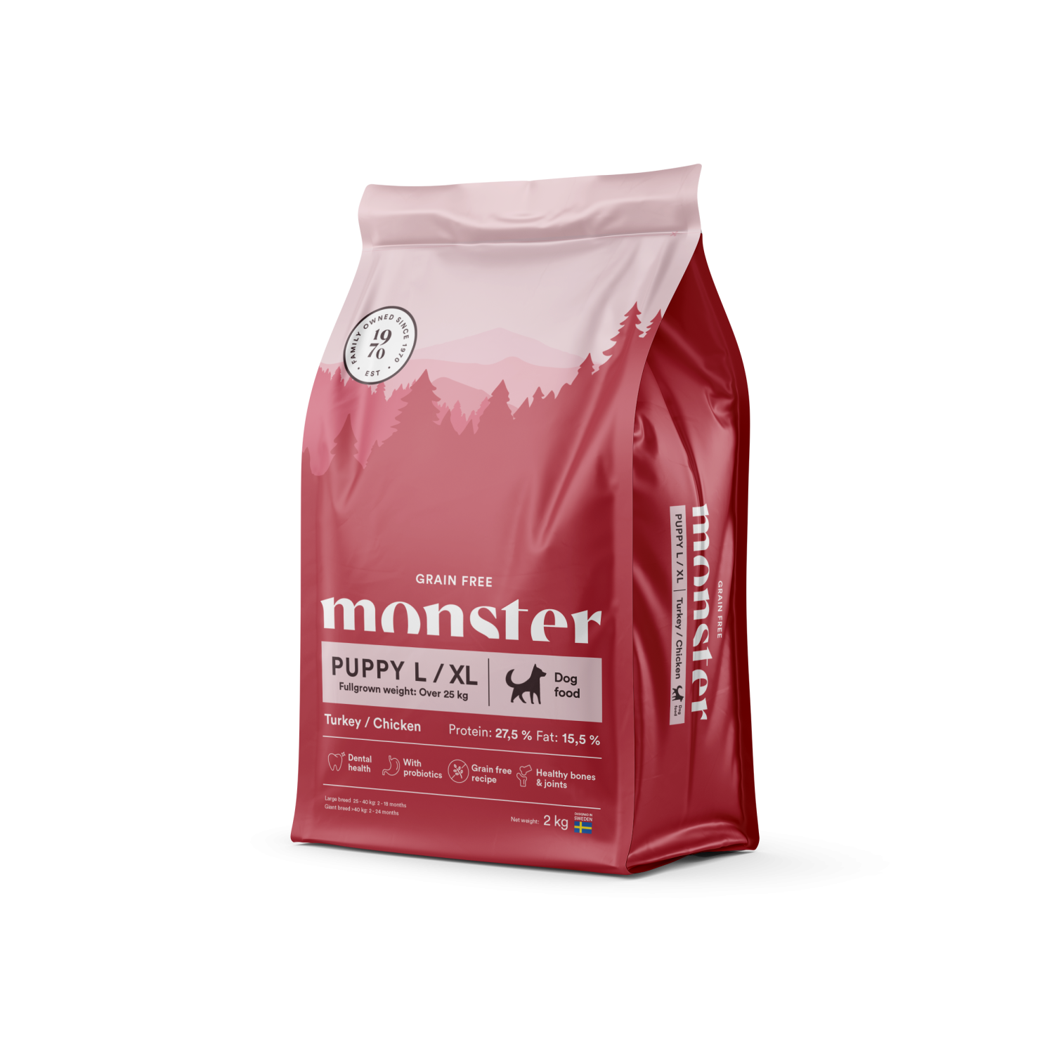 Spannmålsfritt valpfoder för stora & mycket stora hundvalpar, med kalkon & kyckling. Spannmålsfria valpmatsalternativ kan underlätta matsmältningen för hundvalpar med känslig mage & för hundvalpen som är känslig mot spannmål. Anpassat för valpar av stora raser 25-40 kg. Anpassat för valpar av mycket stora raser >40 kg. Monster Dog Grain Free Puppy L/XL Turkey&Chicken