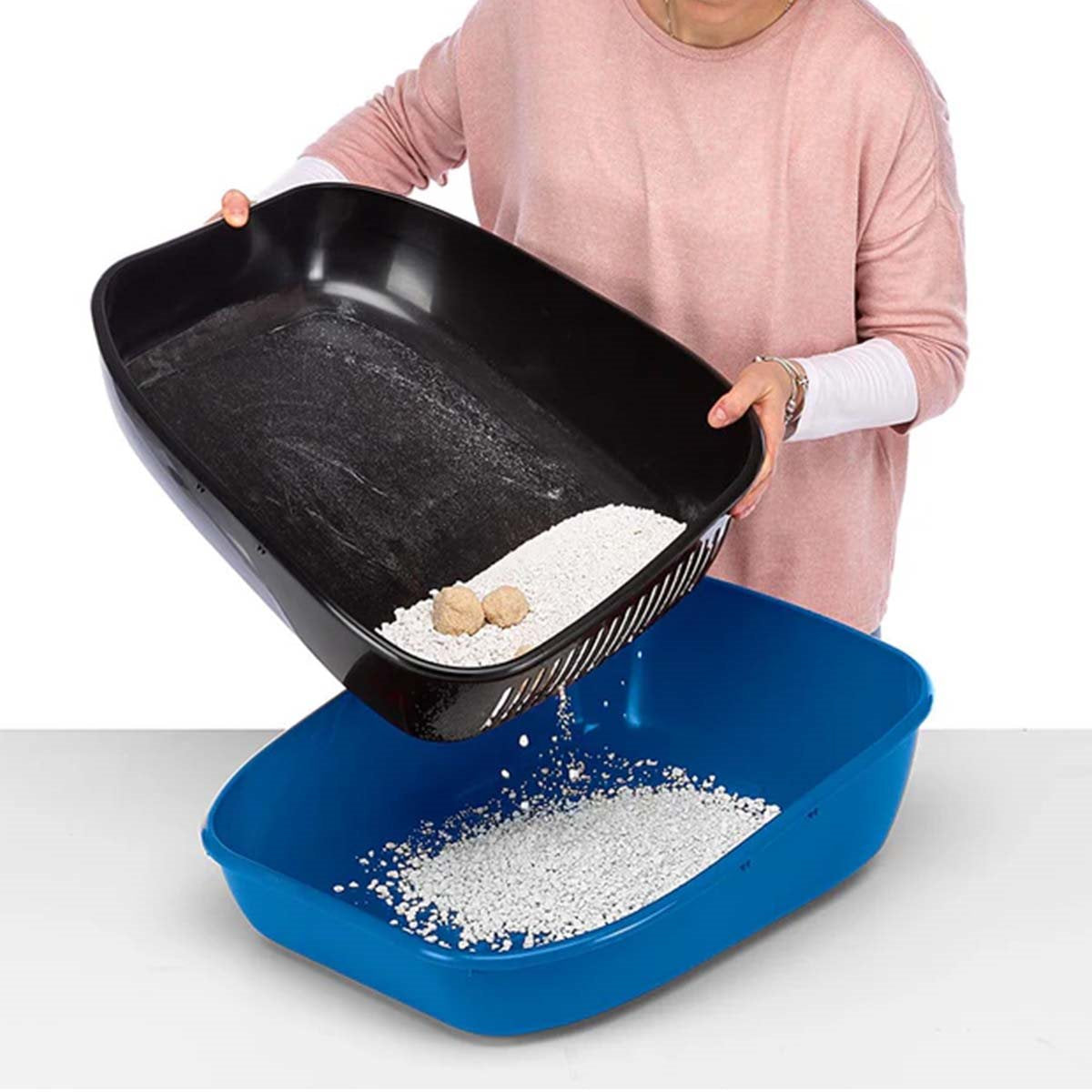Lådan består av två baser – en med ett såll för att separera klumpar och en standardbotten för att samla upp ren kattsand. De runda och kompakta formerna gör den både praktisk och enkel att rengöra.