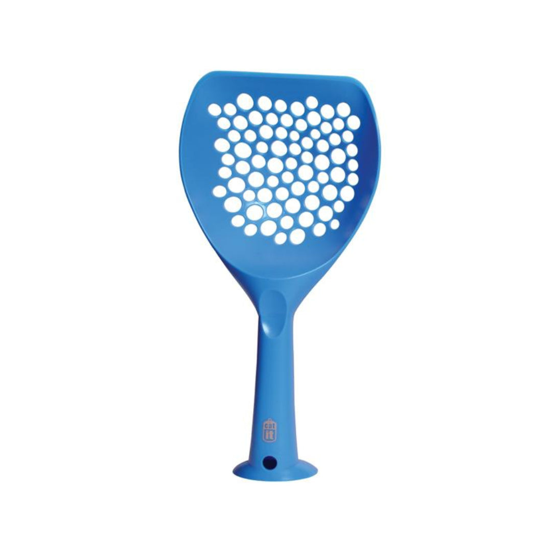 Den har en bred skopa med perforerade hål, vilket gör det lätt att sålla bort klumpar och spara ren kattsand. Det långa handtaget ger ett bekvämt grepp, och basen gör att spaden kan ställas upp när den inte används.