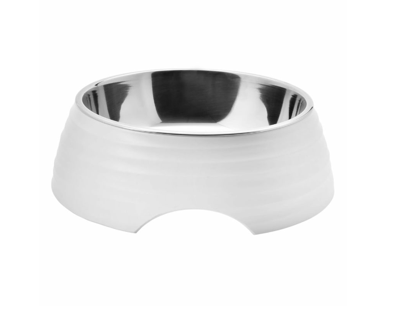 Stilren och klassisk mat- eller vattenskål i melamin med rostfri innerskål. Gummikanten på undersidan tillsammans med skålens tyngd gör att den står stadigt. Tål att diskas i diskmaskin, men ska ej användas i mikrovågsugn.