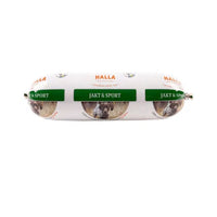 Halla Jakt & Sport är ett smakrikt och näringsrikt helfoder som utvecklats för att möta behoven hos aktiva och arbetande vuxna hundar. Fodret är tillverkat i Sverige  och innehåller kött, organ, grönsaker och kallpressad rapsolja från svenska gårdar. Dessutom är fodret berikat med krill, en utmärkt källa till omega-3 fettsyrorna EPA och DHA, som stöder både inlärningsförmåga och ledhälsa. Produkten är skonsamt ångkokt, vilket bevarar både smak och näringsämnen, och har en lång hållbarhet på 12 månader i rumstemperatur. Efter öppning ska fodret förvaras i högst +8°C och konsumeras inom 2-3 dagar.