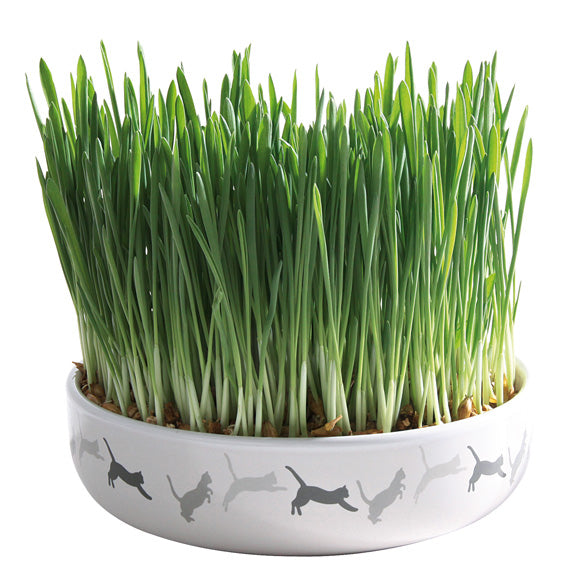 Kattgräs av korn i keramikskål, inklusive 50 g kattfrön att odla själv.