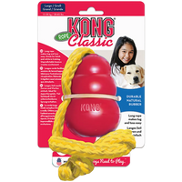 Den klassiska formen av Kong Classic har varit standarden för formen på hundleksaker i över 40 år. Kong Classic med rep är en rolig twist på klassikern med ett rep för extra långa kast vid t.ex apportlek. Den oförutsägbara studsen bidrar till actionfyllda lekstunder. Oförutsägbar studs skapar spänning Finns i tre storlekar: M, L och XL Perfekt för apportträning