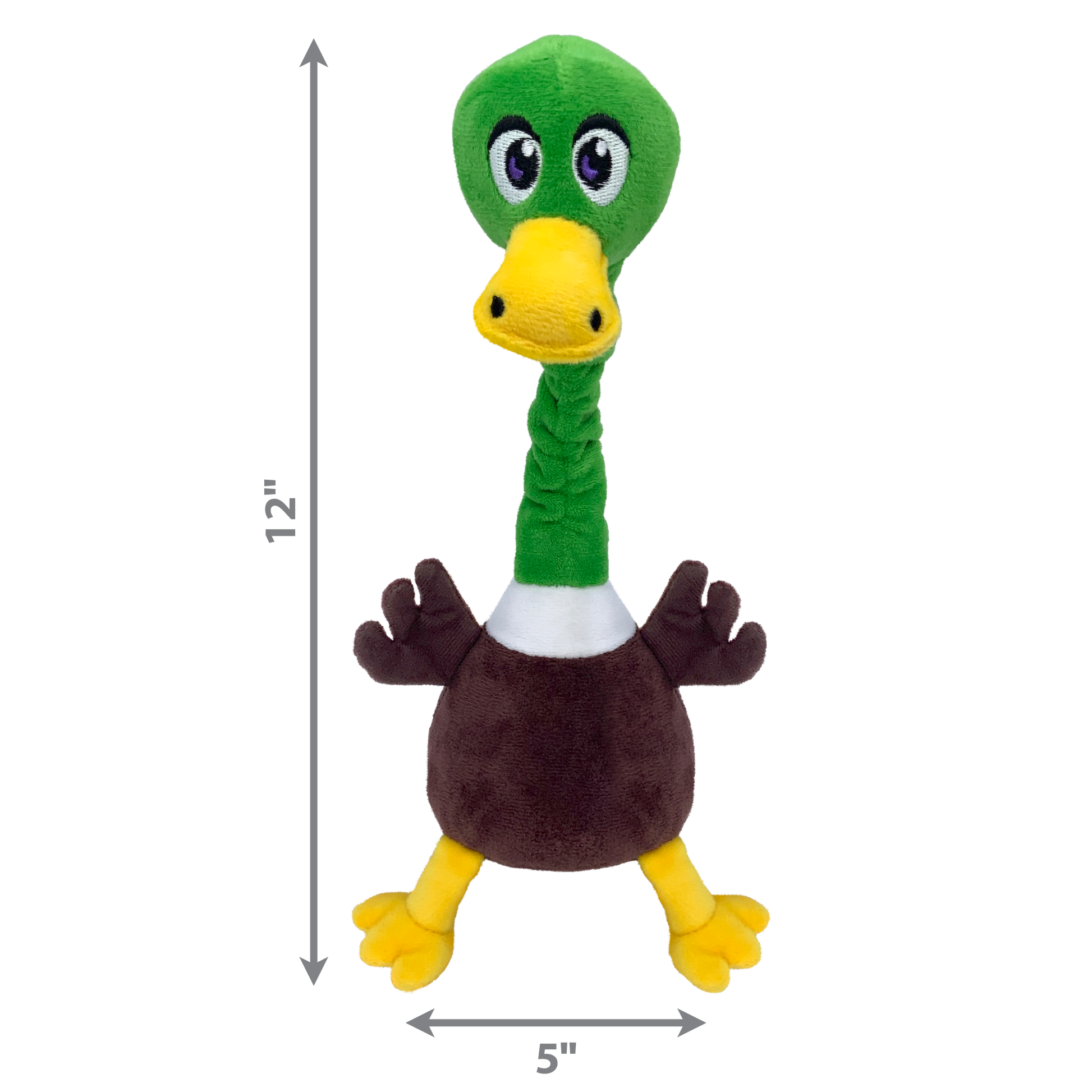 KONG Shakers Bobz Mallard har en tuff, flexibel sladd i sin vingliga hals som låter honom nicka en inbjudan att slå sin långa, floppiga kropp i instinkttillfredsställande anfall av anka-anka. Den lågtonade squeakern förlänger speltiden medan ett lager av förstärkning förlänger skakandet, hämtandet och slängandet.