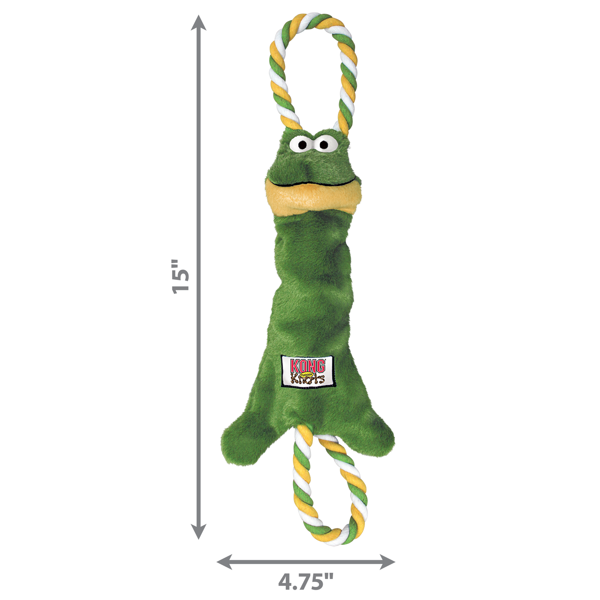 KONG Tugger Knots Frog är en tuff, interaktiv drag- och skakleksak som hundar älskar. Varje leksak har knutna rep inuti för en realistisk känsla, som sträcker sig utanför leksaken och skapar draghandtag i båda ändar. Den här unika designen skapar en fängslande variation av texturer och motstånd som hundar älskar - och den innehåller en pip för extra nöje.