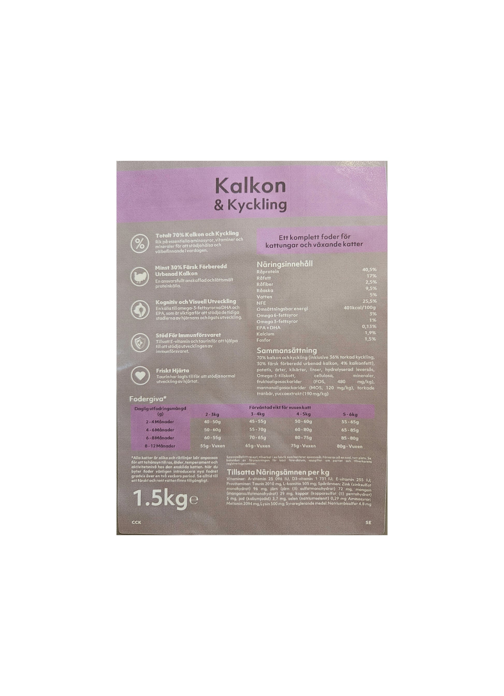 Kattungar växer snabbt, inom sex månader har de uppnått ungefär 75 % av sin vuxna kroppsvikt, så det är viktigt att de får rätt kost för att växa från kattunge till en frisk katt. Vårt fullständiga kattunge recept är framtaget för att ge unga katter den balanserade näring och det ökade energiinnehåll som de behöver under tillväxten. Detta inkluderar en högre nivå av protein, rik på essentiella aminosyror för att stödja en hälsosam muskeltillväxt och tillsatt E-vitamin för att hjälpa till att stödja immunförsvaret. Den mindre foderkulorna i ett kattunge recept bidrar också till att göra måltiderna lätthanterliga.
