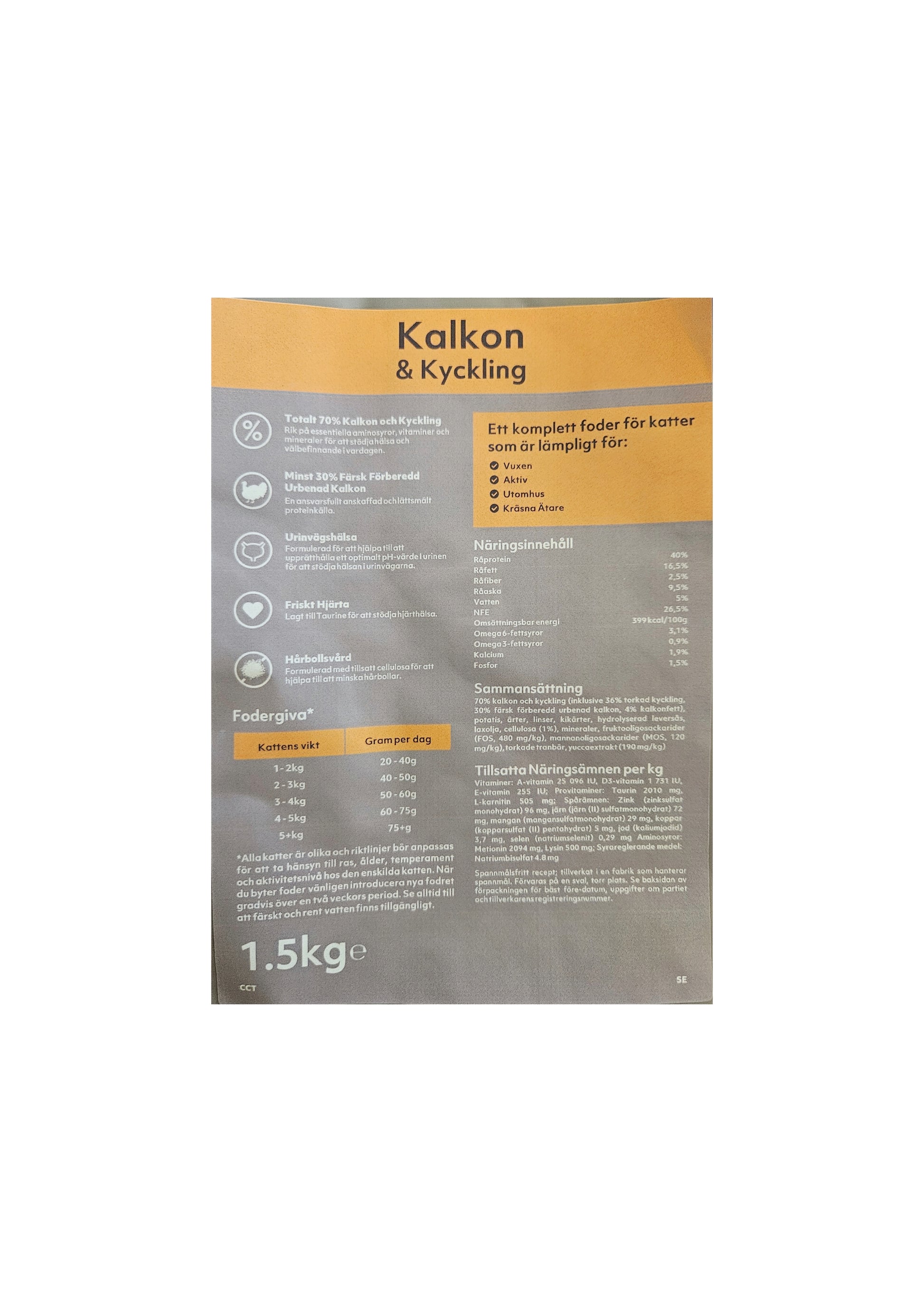 Råprotein 40% Råfett 16.5% Råfiber 2.5% Råaska 9.5% Vatten 5% NFE (Kolhydrater) 26.5% Omega 6-fettsyror 3.1% Omega 3-fettsyror 0.9% Kalcium 1.9% Fosfor 1.5% Omsättningsbar energi 399 kcal/100g