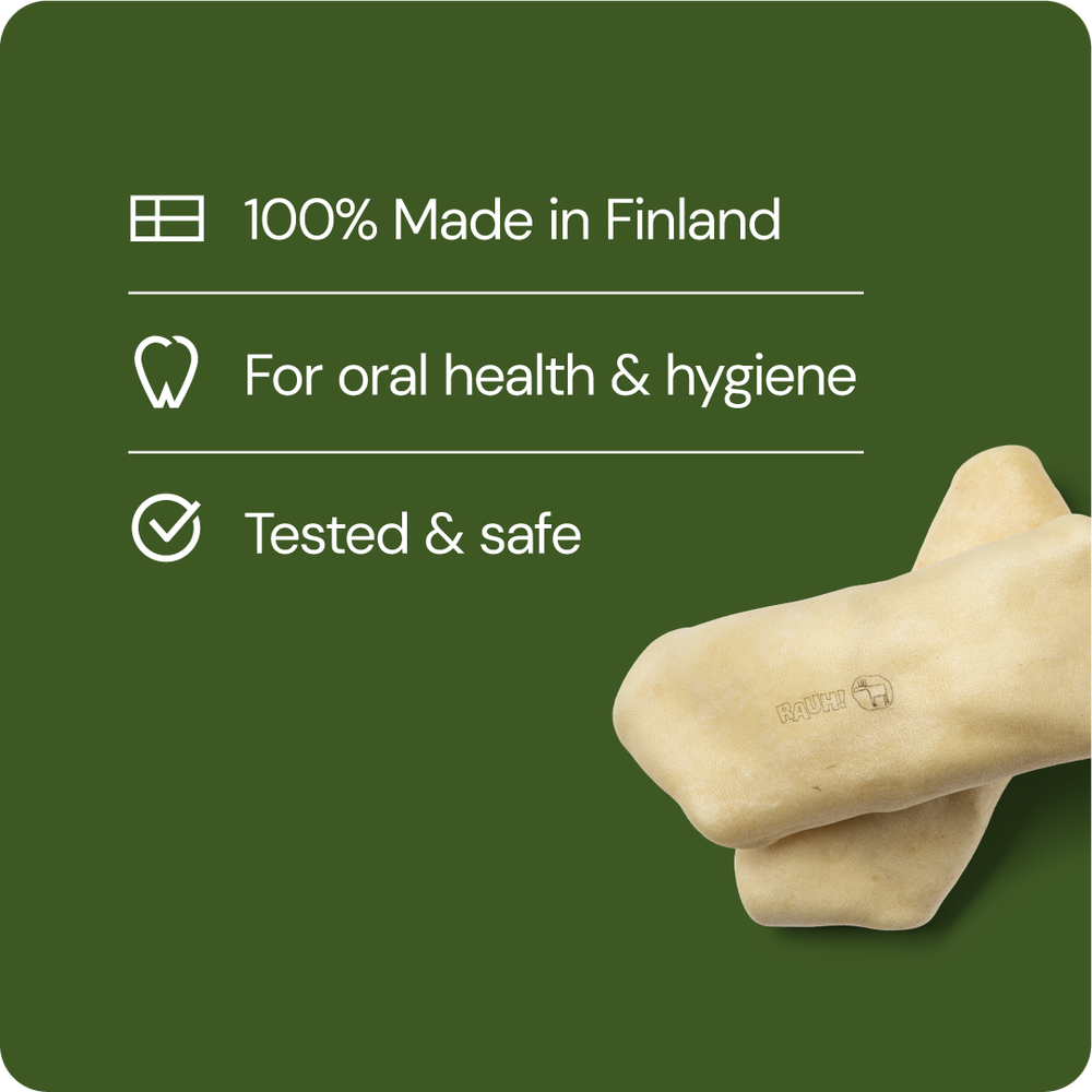 RAUH! tuggbenen tillverkas som hantverk i Finland och bara av råvaror som håller prima kvalitet. Våra tillverkningsmetoder har alldeles från början planerats enbart för tillverkning av tuggben och annat hundgodis, för ditt husdjurs bästa! RAUH! tuggbenen tillverkas alltid av bara ett enda skinnstycke och torkas på traditionellt vis, ÄNDA SEDAN 1989!