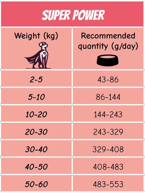 Pow! Dog Super Power är torrfodret är speciellt framtaget för att stödja arbetsamma hundhjältar som kräver extra energi för att orka med sina dagliga utmaningar. Fodret är anpassat för aktiva hundar som behöver maximal energi och näring för att kunna utföra sina uppgifter, oavsett om de vaktar, räddar eller assisterar. Med höga nivåer av protein och fett säkerställer fodret att din hund får den energi som behövs för att hålla sig aktiv och alert. Ingredienserna är noggrant utvalda för att ge en optimal balans mellan smak och näringsinnehåll.
