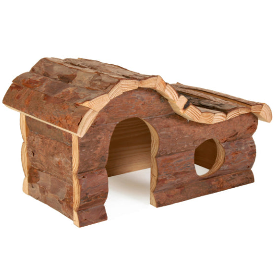 Hamsterhus i naturträ med böljande tak och 1 fönster.
