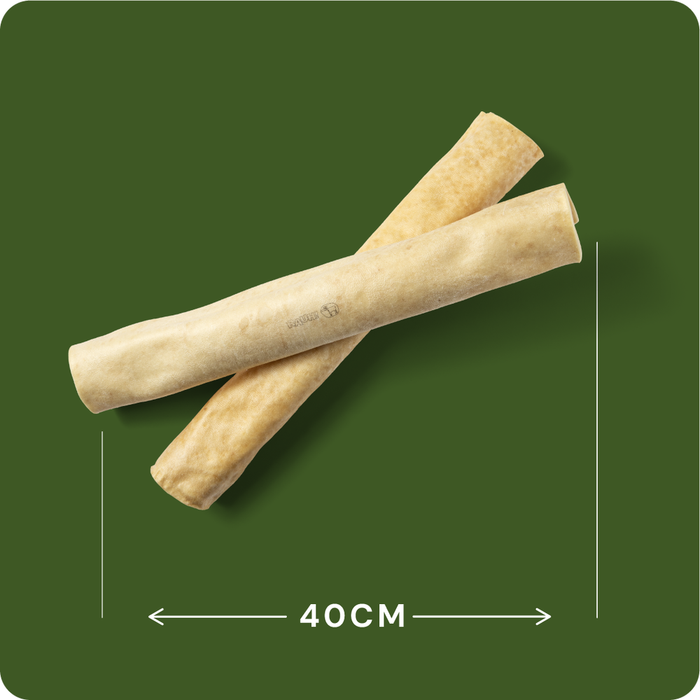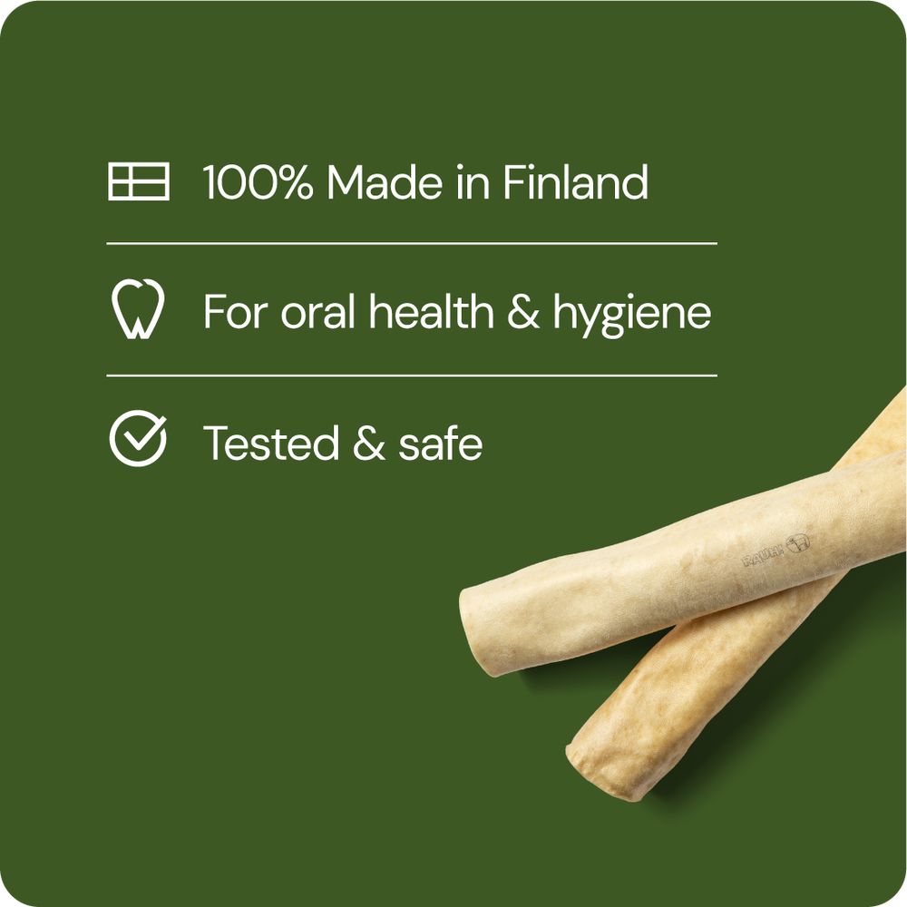 Kom ihåg att hålla uppsikt över din hund när den tuggar på tuggben och att se till att den alltid har tillgång till friskt vatten. Förvaras torrt i rumstemperatur.