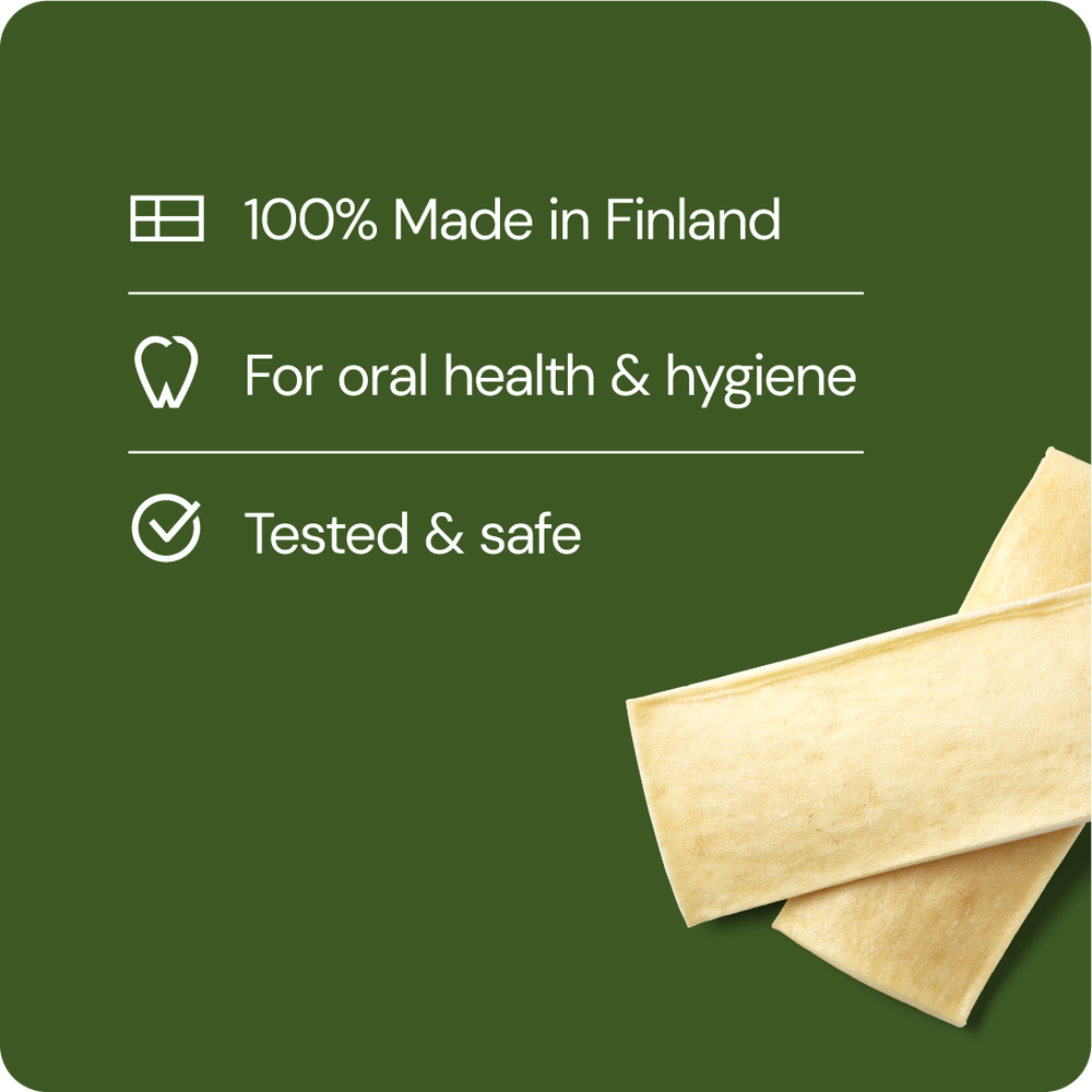 Den äkta och ursprungliga produkten med den finska kvalitetsbeteckningen Nyckelflaggan!Kom ihåg att hålla uppsikt över din hund när den tuggar på tuggben och att se till att den alltid har tillgång till friskt vatten.