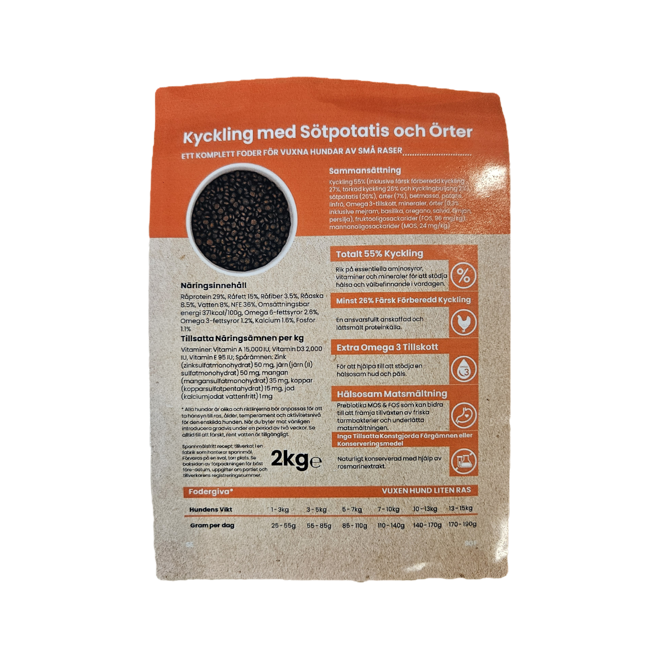 kycklingbuljong 3%), sötpotatis (26%), ärter (6%), potatis, betmassa, linfrö, omega
